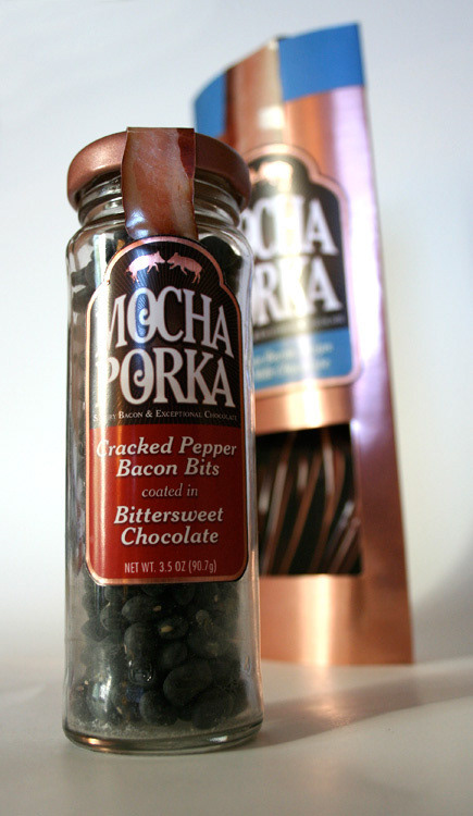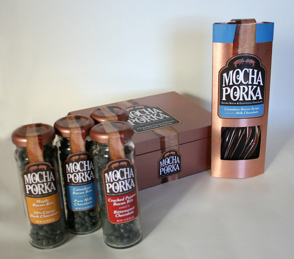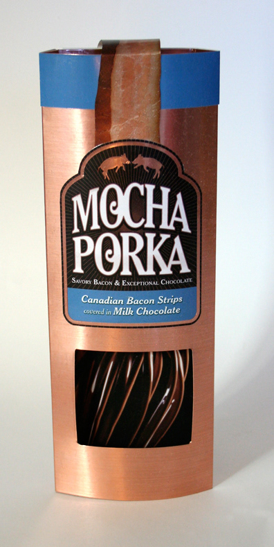 Packaging concepts for chocolate covered bacon products.
