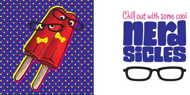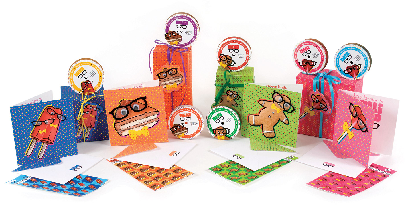 Gift-giving line centered on nerd-ified food. Nerd-Day Cake, Nerdsicles, Lollinerd and the Gingernerd Man. Products include dimensional greeting cards with googley eyes and glasses, wrapping paper, gift tags, ribbons & stickers.