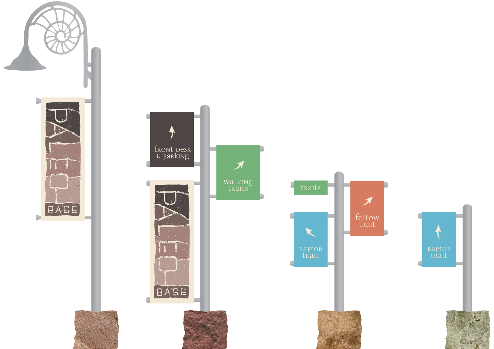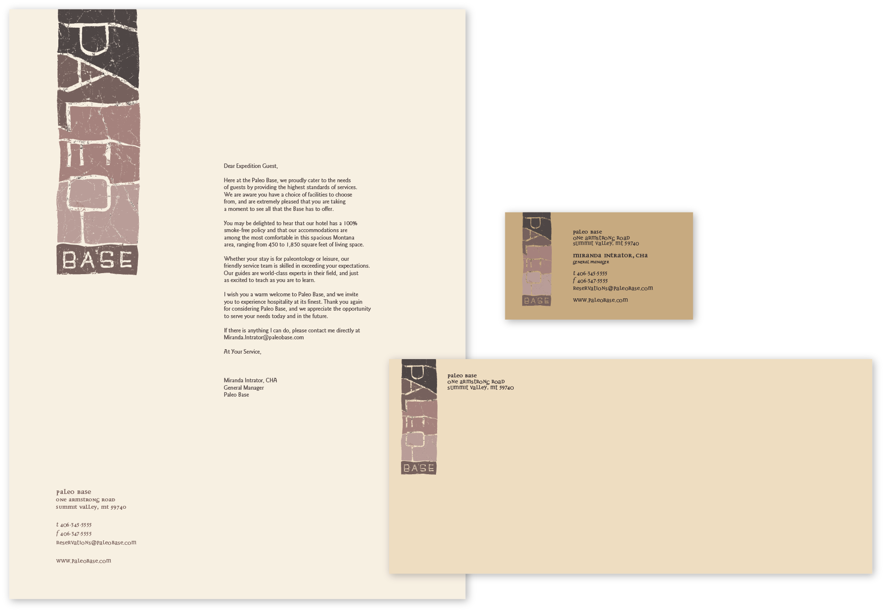 Identity system developed for a boutique hotel that specializes in dinosaur excavation vacations.