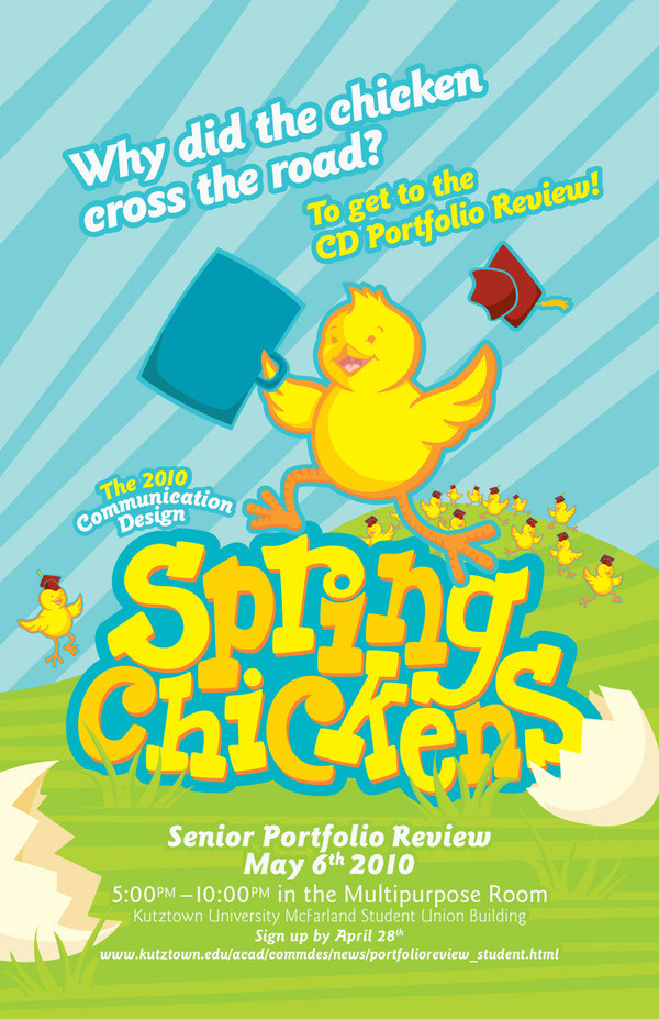 Illustrated promotional materials for the Communication Design student portfolio review at Kutztown University. Features illustrations and handmade typography.